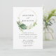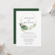 Elegantes convites de casamento tropicais com seus nomes emoldurados por um círculo falso de folha de ouro enfeitado com folhas tropicais de cor d'água em tons de verde complementados por folhagem dourada. Personalize os convites tropicais adicionando os detalhes do seu casamento abaixo. O convite reverte para um fundo verde-escuro. Projetado para coordenar com a nossa coleção de casamento Dourada Tropical.