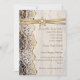 Lace branco elegante, fita e flor no convite para o casamento de madeira com rendas brancas em madeira velha marrom com duas fitas de cetim cruzadas e flor em bege com brilho metálico e uma joia branca. Texto em castanho. Note-se que rendas, madeira, flores e joias são todas "impressas" e não tecidos reais, madeira, joias ou cristais. Este elegante, sofisticado e romântico design com uma essência rústica faz parte de um casamento e é perfeito para um casamento rústico do país ou para um primavera ocidental, verão ou outono/outono com uma paleta de cores neutras.