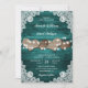 Convites de casamento Rústicos Teais com corações de burlap contra um fundo de madeira adornado com rendas florais brancas e luzes de cordas perfeitas para convidar seus hóspedes para o seu país rústico teal, quintal ou festa de casamento de celeiro.