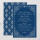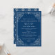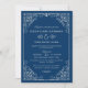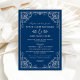 Um convite de casamento retrato refinado com floreios de rolo ornamentados brancos e uma borda de filigrana em um fundo azul marinho profundo. A paleta monocromática branco-no-azul-marinho cria uma elegância náutica crocante com detalhes ornamentais intricados nos cantos. Toda a redação é totalmente editável para capturar sua celebração.