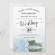 Este maravilhoso convite para o casamento apresenta um design floral moderno com um solteiro longo e empoeirado, azul ou rosa azul-claro, de cor azul, deitado ao seu lado, refletindo em uma piscina com ondas e ondulações. A design é simples, elegante, romântica e sofisticada, com caligrafia antiga e conteúdo totalmente personalizável.