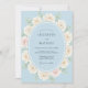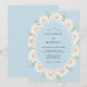 Este design apresenta uma paleta serena de azul suave em pó e branco cremoso. Rosas delicadas em aquarela em tons de marfim e rosa pálido criam um arranjo exuberante de pétalas e folhagens. A estética etérea é perfeita para um evento clássico de primavera ou verão, oferecendo uma atmosfera atemporal e romântica.