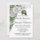 Este convite muito elegante apresenta um lindo buquê floral de rosas brancas, pétalas de rosa verde e frondes de samambaia que o tornariam muito adequado para um casamento de jardim ou para qualquer outro tipo de casamento de temas botânicos. A design inclui também bagas brancas e folhas verdes menores. O reverso do convite apresenta um solteiro, grande ferrão em um fundo branco comum.