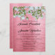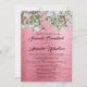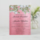 Um convite de casamento metálico rosa, moderno, com aspecto industrial, com um arranjo floral mais tradicional de rosas brancas ao longo da borda superior. Este convite de casamento cor-de-rosa contemporâneo serviria a um casamento com temas mais industriais, especialmente um realizado num local urbano.