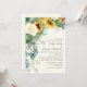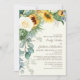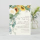 Rústicos, mas elegantes, girassóis amarelos, rosas brancas, eucalipto e outros verdes num convite de casamento de cor creme botânica. Entre em contato conosco para obter ajuda sobre a personalização ou produtos correspondentes. Os nomes da noiva e do noivo estão em uma letra elegante.