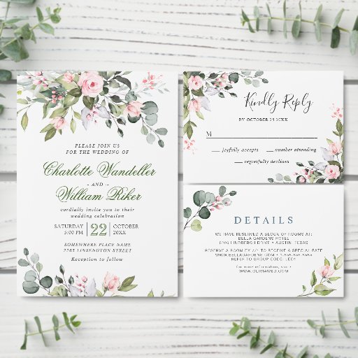 Convites Casamento de Rosas Elegante Eucalyptus Blush