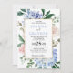 Convite de casamento moderno, com hidrangas azuis claras/poeirentas de cor azul-d'água, com cor pastel rosa, pincel, rosas brancas, peonias, folhas de eucalipto, galhos e folhagem. Tons românticos, suaves e sonhentos, primavera, designs florais de cor d'água de verão para combinar com o seu casamento temático. Por favor, encontre mais designs e variações na minha loja de "blisswedingpaperie". E fique à vontade para me contactar para mais personalizações ou itens correspondentes.