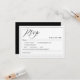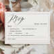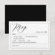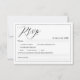 Escrita moderna Chic e elegante script preto e branco casamento rsvp com escolhas de comida, alergias, necessidades dietéticas e escolha de música.