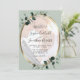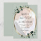 Eucalyptus Foto Dourada de Oval Metálico Convite de Casamento... Nosso sábio convite para casamento com fotos de eucalipto apresenta uma estrutura oval metálica dourada embelezada com folhas de eucalipto abraçadas por esmeraldas, junto a uma foto da noiva e do noivo em um fundo verde-claro. Sua foto será colocada em uma camada abaixo de uma transparência branca para "esmaecer" as cores de alguma forma, para que o texto no topo seja legível. Todo texto de exemplo pode ser facilmente revisado com suas próprias informações sobre o modelo de personalização.
