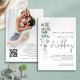 O Moderno Eucalyptus Photo Overlay Elegante Script Sage Wedding. Estilo botânico minimalista elegante, com um roteiro manuscrito para o casamento e o resto do texto que você pode personalizar facilmente. Um galho elegante de folhas de aquarela eucalipto corre pelo lado esquerdo. Substitua a imagem de exemplo no verso por sua.
