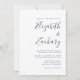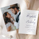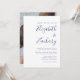 Este simples convite de casamento moderno apresenta texto azul marinho sobre fundo branco. Adicione os nomes da noiva e do noivo na caligrafia de escrita manual do na moda e os detalhes na fonte sans serif. Substitua facilmente a imagem de exemplo no verso por sua própria foto.