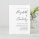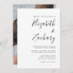 Este simples convite de casamento moderno mostra um texto negro sobre um fundo branco. Adicione os nomes da noiva e do noivo na caligrafia de escrita manual do na moda e os detalhes na fonte sans serif. Substitua facilmente a imagem de exemplo no verso por sua própria foto.