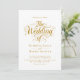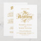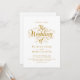 Este elegante convite de casamento branco e ouro é perfeito para um casamento moderno. O simples design apresenta uma elegante caligrafia dourada sobre um fundo branco limpo. O cartão de convite inclui os detalhes do casamento no verso, em vez de pagar um cartão separado.