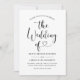 Os convites de casamento modernos preto e branco (cores podem ser modificadas) apresentam um design de tipografia na moda negra com roteiro de caligrafia e sotaque cardíaco. O texto personalizado simples e elegante que pode ser personalizado para convidar convidados a se juntarem às suas comemorações de casamento, incluindo os nomes dos casais e todos os detalhes importantes da cerimônia de casamento.