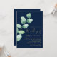 Casamento de Script de Código QR Azul e Dourado do Elegante Eucalyptus Marinho. Com o seu código QR para o seu website de casamento no fazer traseiro, esta é uma opção conveniente para todos os seus convidados para RSVP e ver todos os detalhes sem a necessidade de RSVP separado e cartões de detalhes. À esquerda, encontra-se um simples ramo de cor aquosa verde eucalipto e a redação é alinhada à direita. O Wedding Of está em um script de conjunto de estilos manuscrito e o resto do texto que você pode personalizar facilmente e digitar o URL de seu site necessário para atualizar automaticamente o código QR de amostra para levar para a sua própria página da Web escolhida.