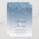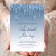 Este design apresenta um fundo ombre azul com uma borda superior de gotas brilhantes azuis. Os primeiros nomes do casal aparecem em um script azul elegante sobre um grande e branco, com o texto restante na fonte sans serif. O fundo ombre e a borda de gotejamento azul são repetidos no sentido inverso.