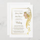 Um convite elegante de casamento em ouro que inclui uma armação em ouro ornamentado com um embelezamento em ouro com flores cor-de-rosa pinceladas como parte do quadro. Os locais de cerimônia e recepção foram incluídos no convite. O texto é facilmente personalizado para que você adicione seus próprios detalhes conforme necessário.