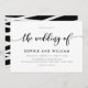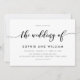 Convite para na moda de Casamento com as palavras "o casamento de" em uma escrita cursiva relaxada em preto contra fundo branco. A placa tem um lado preto com linhas brancas sobrepostas. Personalize-o substituindo o texto do marcador de posição. Para obter mais opções, como alterar a fonte e seu tamanho/cor ou o espaçamento entre letras, clique no botão "Personalizar". *Observe que a Marca d'água do Zazzle que aparece na visualização de zoom NÃO aparecerá no produto impresso final. © Rosewood e Citrus