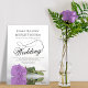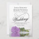 Este belo convite para o casamento apresenta uma bela fotografia de um solteiro de cor púrpura lilás empilhada ao longo de um rosa que se encontra ao seu lado refletindo numa piscina de água com ondas e ondulações. O design apresenta um roteiro de caligrafia rico com um fazer de cauda longa e encaracolada, moderno e clássico. Uma maneira elegante, sofisticada e chique de convidar seus amigos e família para compartilhar seu dia especial. A parte traseira da placa é uma cor púrpura clara e marmoreada com um padrão de pelúcia.