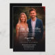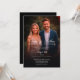 A design mostra um olhar moderno e minimalista com uma paleta de cores preta e branca. O ponto focal é a sua foto com uma elegante camada preta, A bela tipografia da escrita mostra os nomes do casal e as informações do casamento.