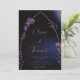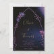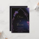 Rosas e folhas de eucalipto, desenhadas à mão em lápis colorido e revestidas digitalmente com roxo, fazem um convite de casamento moderno, sofisticado, elegante, mas chic, que tem um quadro simples e minimalista de arco gótico. O fundo azul preto e escuro com pistas de roxo e luzes iluminam o céu da meia-noite. A elegante caligrafia, na matiz do ouro, torna esse convite na moda preto e roxo ainda mais elegante.