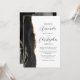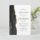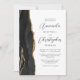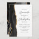 A borda esquerda deste elegante convite de casamento moderno apresenta uma coloração aquosa preta, borda agitada, aparada com falso brilho dourado. O texto personalizável combina fontes de script e sans serif em cinzas de carvão em um fundo branco. O verso apresenta um design de agate preto e dourado correspondente.