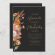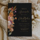 A borda esquerda deste elegante convite de casamento moderno apresenta um arranjo floral de cor aquosa em tons de ferrugem, laranja queimada, rosa empoeirado, marfim e verde-sábio. O texto personalizável combina o script dourado e as fontes sans serif em um plano de fundo off-black. O verso apresenta um buquê de outono menor correspondente sobre as iniciais do casal em um script dourado.