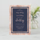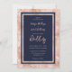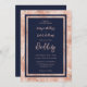 Os convites de casamento Elegantes, azul e rosa ouro, com uma letra moderna de escrita e detalhes de casamento, apresentaram dentro a um brilho rosa de luxo, uma imagem azul de pincel e marinho. Personalizar facilmente online.