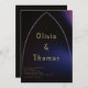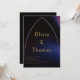 Um arco gótico estilizado e moderno e minimalista e uma caligrafia gótica de ouro fazem um convite de casamento moderno, sofisticado, elegante e chique que tem um tema de casamento gótico simples e minimalista. O fundo azul preto e escuro com pistas de roxo e luzes iluminam o céu da meia-noite.
