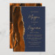 A borda esquerda deste elegante convite de casamento moderno apresenta uma cor de água laranja queimada, aparada com falsa brilho dourado. O texto personalizável combina um script de escrita manual dourado e uma letra sans serif num fundo azul escuro de marinho. O verso apresenta uma design de cor laranja queimada e dourada.
