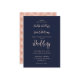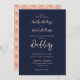 Rosa de ouro elegante e convite de casamento azul marinho com uma letra moderna. Um padrão rosa de ouro na parte traseira da placa. Personalize facilmente esses convites de casamento marinho e azul modernos com seus detalhes de casamento. Escolha perfeita para sua queda elegante, ou festa de casamento no inverno.