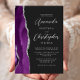 A borda esquerda deste elegante convite de casamento moderno apresenta uma cor d'água roxa, borda agitada com falso brilho prateado. O texto personalizável combina fontes de script e sans serif em cinzas prateadas claras em um fundo preto de slate. O verso apresenta um design de agata prateado e roxo correspondente.