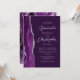 A borda esquerda deste elegante convite de casamento moderno apresenta uma cor d'água roxa, borda agitada com falso brilho prateado. O texto personalizável combina fontes de script e sans serif em cinzas prateadas leves em um fundo roxo profundo. O verso apresenta um design de agata prateado e roxo correspondente.