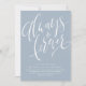 O recurso de convites simples modernos escreveu manuscritos "sempre e sempre" em fundo azul empoeirado editável a cores, personalizá-los com seus detalhes de casamento, elegantes e na moda, Veja todas as peças correspondentes na coleção.