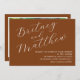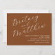 Simples convite de casamento de fotos minimalista em terracota com um roteiro elegante de caligrafia para noiva e noivo.