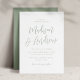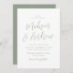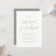 Convites de casamento minimalistas com seus nomes exibidos em um simples roteiro verde de sábio com seus detalhes de casamento mostrados abaixo. O convite inverte-se para um fundo verde de sábio sólido.