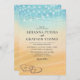 Advertências elegantes para o destino da praia convites de casamento com areia amarela rústica e mbre para fundo azul-d'água, luzes de cordas, dois corações na areia com suas iniciais, e um simples modelo de casamento que é fácil de personalizar.