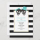Casal do crânio e listras brancas e pretas aqua convite para o casamento de Halloween. Um casal preto divertido com um arco azul aqua e um chapéu emparelhado com uma elegante borda de padrão listrado preto e branco são os elementos deste convite moderno.