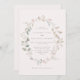 Um bonito convite formal para o casamento perfeito para o primavera ou verão com uma coroa de água, corada oval, coroa floral, com flores pinceladas, folhas verdes de mão. O fundo está em sutil cor-de-rosa-claro.