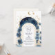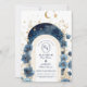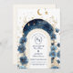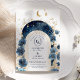Um design de casamento luxuoso com tema celeste, com um jardim floral azul de meia-noite, sotaque de ouro, e uma lua crescente de ouro enquadrada por um arco de ornamentado. Perfeito para casais que buscam uma celebração romântica, mística e inspirada na noite estelar com detalhes cósmicos elegantes.