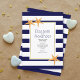 Starfish e convite de casamento de praia de listras brancas azuis marinhos. Os elementos desta modelo de convite para casamento são o padrão marinho azul e branco listrado e o peixe-estrela nos cantos de um quadro branco com o seu texto.