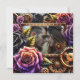 Um belo convite para o casamento floral steampunk floral. A frente é enfeitada com belos rosas roxos e pretos, engrenagens de ouro e cobre e um modelo para carregar sua foto favorita. Isso é feito em tons dourados, roxos e pretos e tem uma estética gótica.