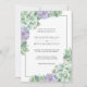 Convite de casamento botânico com seus detalhes em um dentro de fonte de cinza macia de um quadro decorado com suculentos de aquarela verde e roxa. A parte de trás tem uma lavagem com aquarela verde. Os suculentos adicionam um elemento natural excelente ao design. Estes convites são perfeitos para um casamento no deserto na primavera ou no verão.