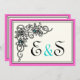 Convite para o casamento da tartaruga-rosa-preta, de videira negra, com flores com centro azul-turquesa, borda dupla-negra e rosa-quente e uma elegante letra formal escrita sobre fundo marfim/névoa. Um design floral contemporâneo com um toque de vintage, perfeito para um primavera ou casamento de verão moderno ou tradicional. Este design na moda pode ser usado em outras ocasiões especiais, como aniversários, noivados ou aniversários.