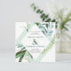 Folhagem botânica verde e azul-lacrimogênea cria uma moldura geométrica para os detalhes do seu casamento. Uma lavagem verde de menta macia define ainda mais a estrutura. Uma ampola decorativa traz o design para o texto. Os nomes dos casais de casamento são um texto verde ousado. A parte de trás do convite para o casamento é um verde sensual.