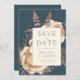 Este elegante casamento Salve o cartão de datilografia apresenta um buquê floral robusto e romântico em marfim com folha de ouro rosa e folhagem brilhante num fundo teal. Personalize o texto cor-de-rosa rosa em fontes na moda num retângulo de marfim e adicione o URL do site de casamento ao retângulo sólido.