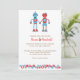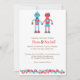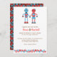 Um belo par de robôs e engrenagens vermelhos e azuis em tamanhos variados adornam esta suíte de convites de casamento. Esta design é perfeita para casais que querem algo único e memorável para anunciar sua celebração.