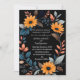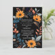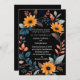 Esta design de cartão de casamento apresenta uma elegante e oval estrutura floral centrada num fundo negro profundo. O quadro é composto por girassóis cor de laranja vibrantes, complementados por um conjunto de folhas e prigos azuis, cinzas e cor de pêssego, criando uma mistura harmoniosa de tons quentes e legal. O arranjo de flores e folhagem forma uma fronteira natural ao redor do cartão, fazer perfeito para mostrar os detalhes do casamento no centro. A design combina a sofisticação moderna com um toque de charme rústico, fazer-a uma escolha ideal para um casamento que abraça tanto a elegância quanto a beleza da natureza. Personalize o cartão com seus nomes e detalhes do casamento. Você pode baixar a placa para seu dispositivo móvel ou computador. O cartão foi criado com a ajuda do ai.