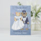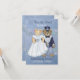 Noiva e noivo adoráveis ursos de pelúcia. Este casal bonito está vestido com suas roupas de casamento. Ele está em seu smoking e cartola e ela está em seu vestido de noiva e véu. O belo fundo azul claro tem um motivo floral suave com uma bela borda de acento floral detalhada na frente e atrás. Todo o texto está pronto para você personalizar.