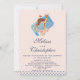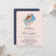 Um lindo veado marrom com costas brancas manchadas. Um passarinho sentado nas costas do veado. Um buquê floral sofisticado em rosa pastel e verde. Um retângulo azul atrás da imagem. Uma borda de bolinhas ao longo da parte inferior. Design inocente e doce. Personalize com os detalhes do seu casamento.